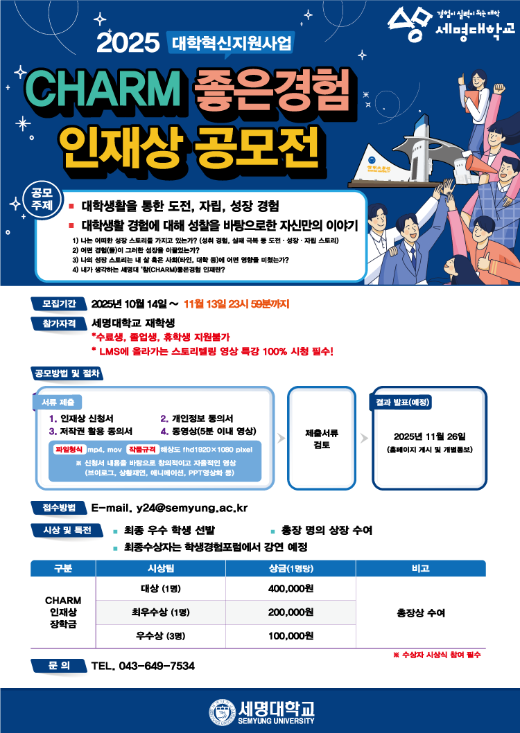 본문 시작 홈으로 학과생활 학과소개 교수소개 교과과정 학과생활 홈페이지가이드 공지사항 공지사항 사진게시판 전공자료실 동아리 학과행사 공지사항 페이스북 트위터 프린트 [대학혁신지원단] 2025 참(CHARM) 좋은경험 인재상 공모전 산업디자인학과 조회 : 11 등록일 : 2025-10-15 붙임1. 2025 세명 참(CHARM)좋은경험 인재상 공고문.hwp ( 51 kb) ?atchFileId=FILE_000000000231376&fileSn=0 붙임1. 2025 세명 참(CHARM)좋은경험 인재상 공고문.hwp 붙임2. 2025 세명 참(CHARM)좋은경험 인재상 신청서.hwp ( 180 kb) ?atchFileId=FILE_000000000231376&fileSn=1 붙임2. 2025 세명 참(CHARM)좋은경험 인재상 신청서.hwp 목록 이전[취창업처] IAP경진대회 담당부서 : 산업디자인학과 담당자 : 류상현 연락처 : 043-649-1436 최종수정일 : 2024-10-26 만족도조사 만족도 조사 이 페이지에서 제공하는 정보에 대하여 만족하시나요? 매우만족 만족 보통 불만족 매우불만족