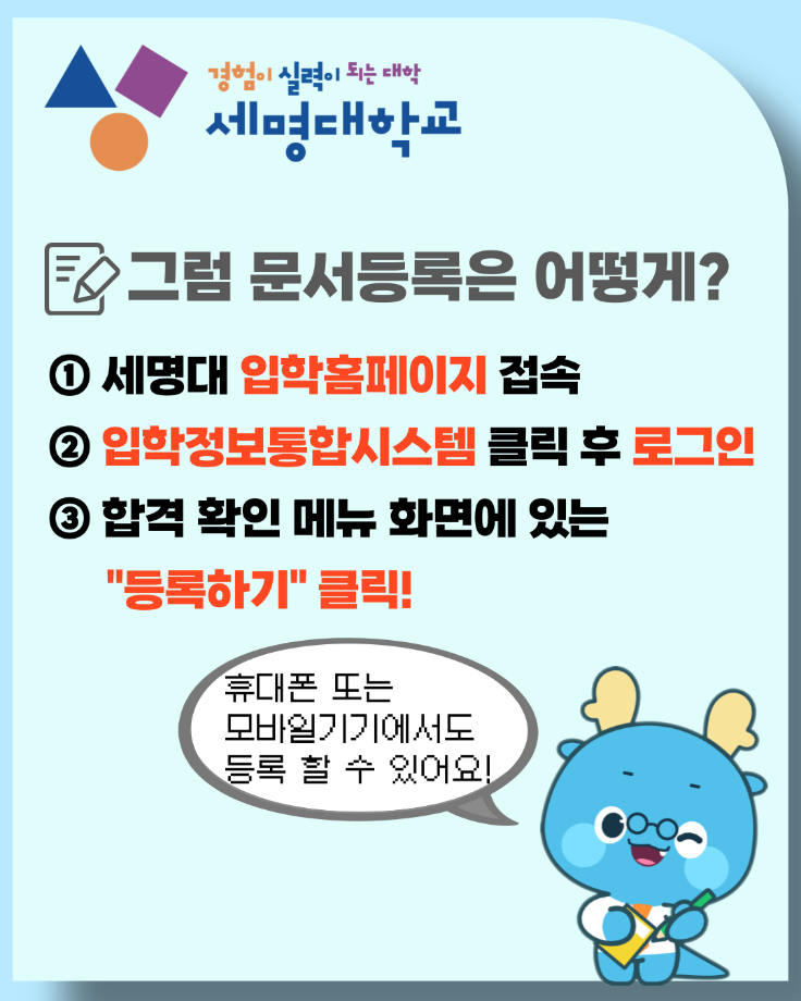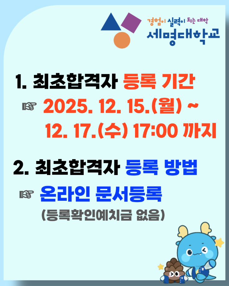 본문 시작 홈으로 학과생활 학과소개 교수소개 교과과정 학과생활 홈페이지가이드 사진게시판 공지사항 사진게시판 전공자료실 동아리 학과행사 사진게시판 페이스북 트위터 프린트 [수시모집] 2026학년도 수시모집 최초합격자 등록안내 산업디자인학과 25 2025-12-15 목록 이전[설경] 세명대학교 설경 담당부서 : 산업디자인학과 담당자 : - 연락처 : 043-649-1436 최종수정일 : 2024-10-26 만족도조사 만족도 조사 이 페이지에서 제공하는 정보에 대하여 만족하시나요? 매우만족 만족 보통 불만족 매우불만족