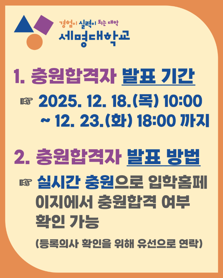 본문 시작 홈으로 학과생활 학과소개 교수소개 교과과정 학과생활 홈페이지가이드 사진게시판 공지사항 사진게시판 전공자료실 동아리 학과행사 사진게시판 페이스북 트위터 프린트 [수시모집] 2026학년도 수시모집 충원합격자 발표안내 산업디자인학과 131 2025-12-18 목록 이전[수시모집] 2026학년도 수시모집 최초합격자 등록안내 다음 [정시모집] 2026 세명대학교 정시모집 전형방법 담당부서 : 산업디자인학과 담당자 : - 연락처 : 043-649-1436 최종수정일 : 2024-10-26 만족도조사 만족도 조사 이 페이지에서 제공하는 정보에 대하여 만족하시나요? 매우만족 만족 보통 불만족 매우불만족