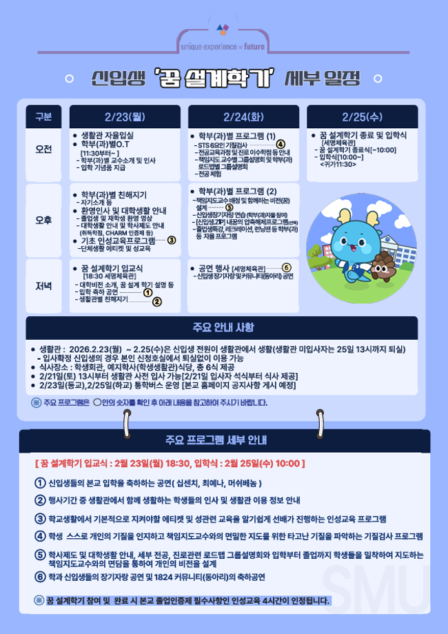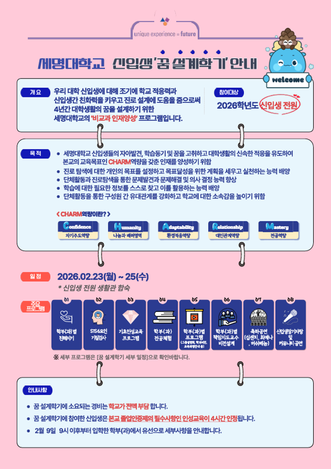본문 시작 홈으로 학과생활 학과소개 교수소개 교과과정 학과생활 홈페이지가이드 사진게시판 공지사항 사진게시판 전공자료실 동아리 학과행사 사진게시판 페이스북 트위터 프린트 [학생처] 2026학년도 신입생 '꿈 설계학기(오리엔테이션)' 시행 산업디자인학과 96 2026-02-04 목록 이전다이소 세명대점 오픈(2/19) 안내 다음 [학생처] 2026학년도 신입생 '꿈 설계학기' 기간 중 통학버스 운행 안내 담당부서 : 산업디자인학과 담당자 : - 연락처 : 043-649-1436 최종수정일 : 2024-10-26 만족도조사 만족도 조사 이 페이지에서 제공하는 정보에 대하여 만족하시나요? 매우만족 만족 보통 불만족 매우불만족