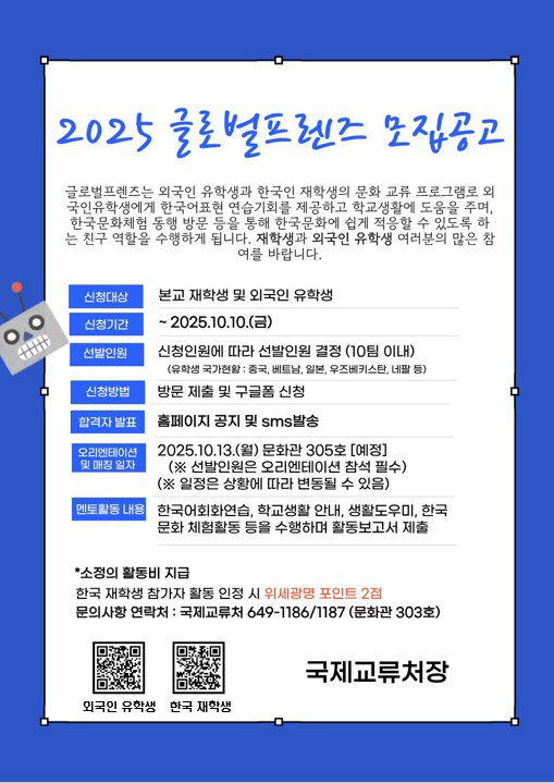 국제교류처에서는 학생들의 나눔과 배려 역량 강화를 위해 🍀글로벌 프렌즈🍀를 모집합니다.