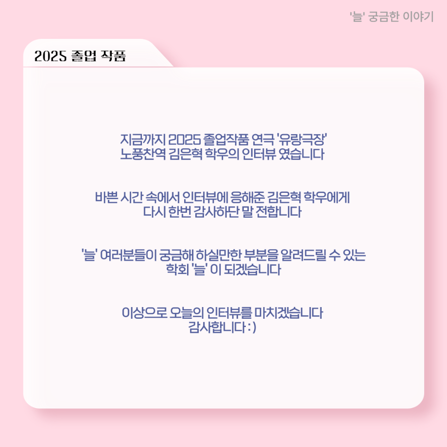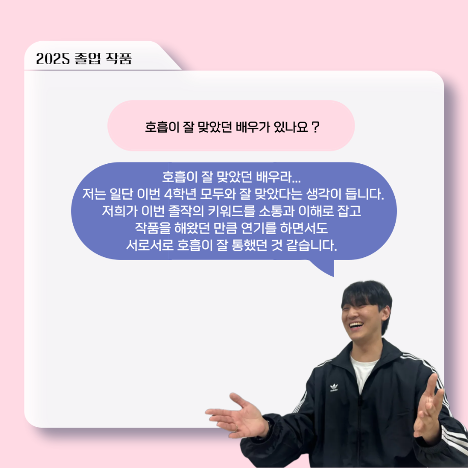 본문 시작 홈으로 커뮤니티 학과소개 입학정보 교수소개 학과과정 커뮤니티 공연예매 안내 홈페이지가이드 포토갤러리 공지사항 포토갤러리 작품DB 동아리 학사일정 학생회 포토갤러리 페이스북 트위터 프린트 ‘늘‘ 궁금한 이야기 - 2025 졸업작품 ‘유랑극장’ 노풍찬役 < 김은혁 > 연기예술학과 189 2025-12-05 . 목록 이전‘늘‘ 궁금한 이야기 - 하계 프로젝트 ‘사랑의 온도’팀 주지환役 < 신승현 > 담당부서 : 연기예술학과 담당자 : - 연락처 : 043-649-1733 최종수정일 : 2024-10-26 만족도조사 만족도 조사 이 페이지에서 제공하는 정보에 대하여 만족하시나요? 매우만족 만족 보통 불만족 매우불만족