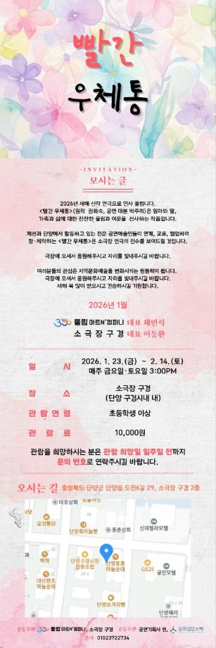 본문 시작 홈으로 MCC News 학과소개 교수소개 학과과정 MCC News MCC SNS 홈페이지가이드 교수 및 졸업생 학과 및 재학생 교수 및 졸업생 미디어 정보통 교수 및 졸업생 페이스북 트위터 프린트 권화숙 교수님 희곡 빨간우체통 공연 안내 미디어콘텐츠창작학과 1004 2026-01-16 권화숙 교수님께서 작성하신 희곡 작품 '빨간우체통'이 연극무대에 올려지게 되었습니다. 자세한 내용은 위 사진을 참고해주시면 됩니다. 목록 이전권화숙 교수님 향기로운 삶, 문인화 전시회 안내 담당부서 : 미디어콘텐츠창작학과 담당자 : - 연락처 : 043-649-1741 최종수정일 : 2024-10-26 만족도조사 만족도 조사 이 페이지에서 제공하는 정보에 대하여 만족하시나요? 매우만족 만족 보통 불만족 매우불만족