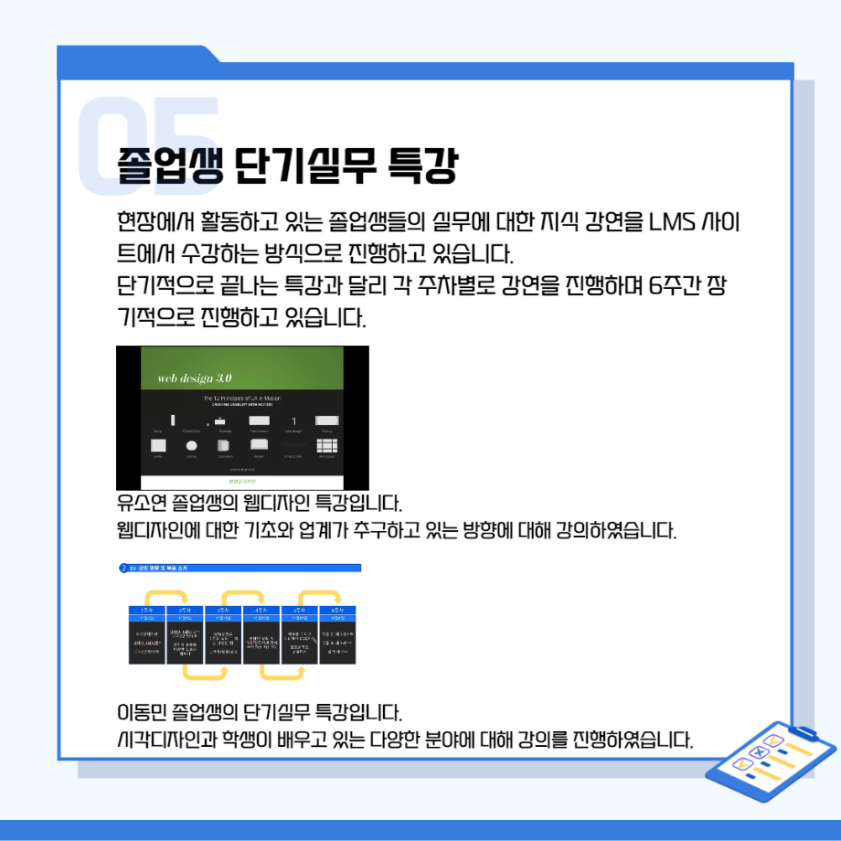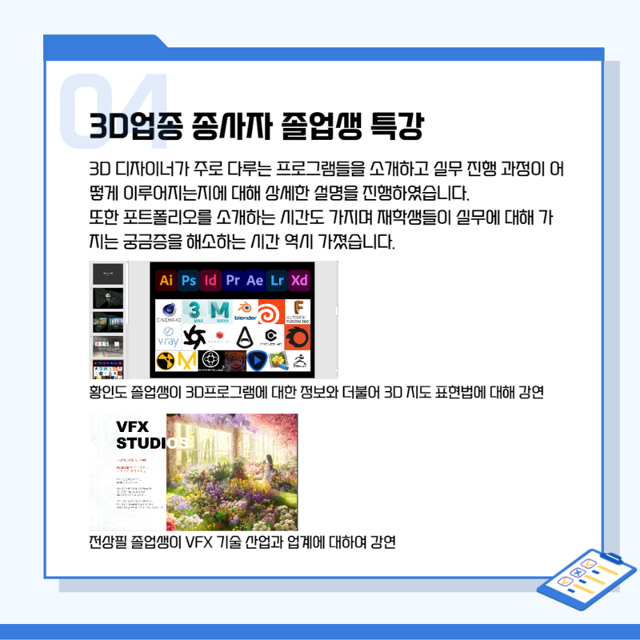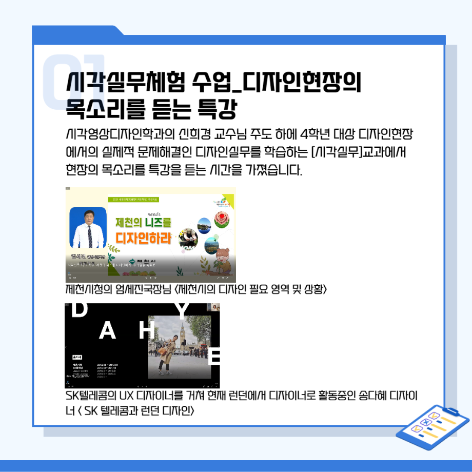 본문 시작 홈으로 시영소식 학과소개 학과과정 시영소식 입학/취업 AI 학과자랑 SNS소통 홈페이지가이드 학과행사 공지사항 학과행사 공모전 학생 인터뷰 학과행사 페이스북 트위터 프린트 시각영상디자인학과 특강 총정리! 시각영상디자인학과 2652 2022-02-07 목록 이전[대학혁신지원사업]단기실무 프로그램 다음 인문예술대학 특강 - 변화와 혁신의 시대! 열정과 디테일로 승부하라!!! 담당부서 : 시각영상디자인학과 담당자 : - 연락처 : 043-649-1726 최종수정일 : 2024-10-26 만족도조사 만족도 조사 이 페이지에서 제공하는 정보에 대하여 만족하시나요? 매우만족 만족 보통 불만족 매우불만족