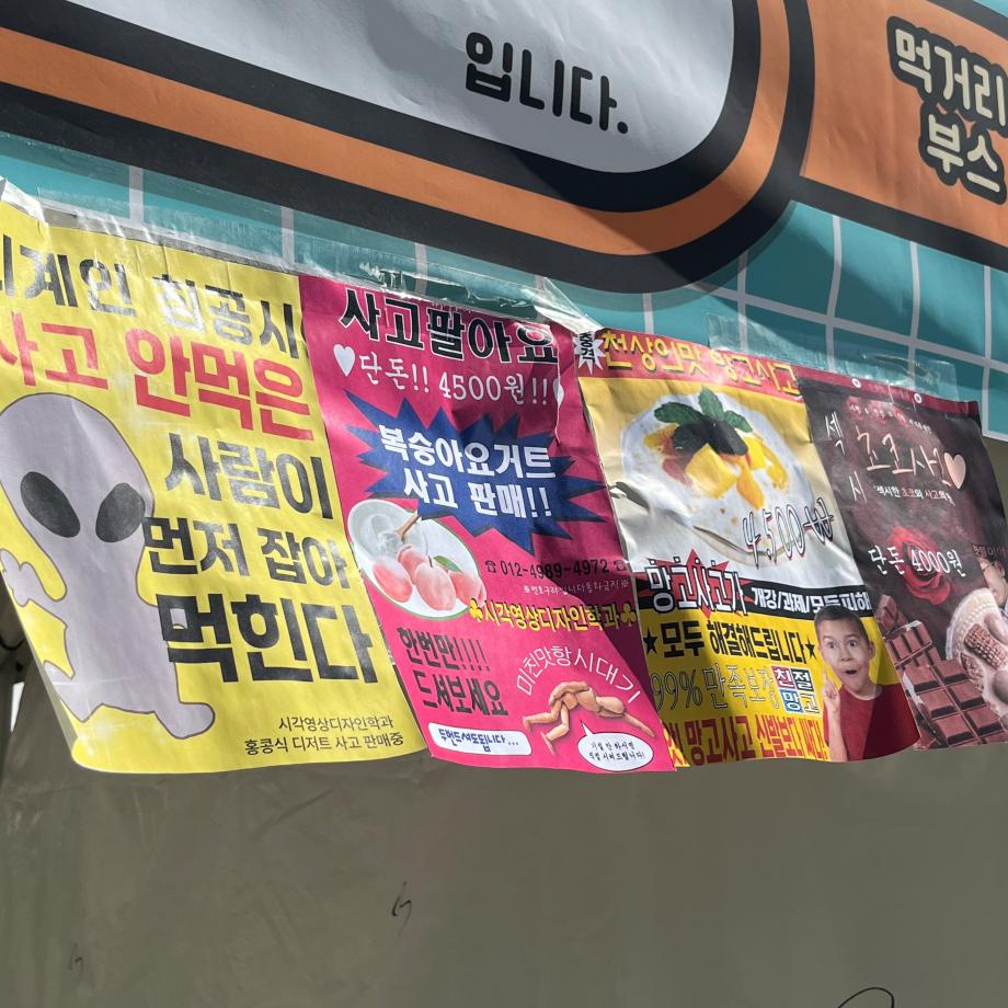 본문 시작 홈으로 시영소식 학과소개 학과과정 시영소식 입학/취업 AI 학과자랑 SNS소통 홈페이지가이드 학과행사 공지사항 학과행사 공모전 학생 인터뷰 학과행사 페이스북 트위터 프린트 2024년 청룡 축제 - 시각영상디자인학과 먹거리부스 시각영상디자인학과 1568 2024-10-01 이번 2024년 청룡축제에서 시각영상디자인학과 4학년 15명이 모여 판매한 먹거리부스는 홍콩식 과일 디저트인 <사고>입니다! 저희는 망고, 복숭아요거트,초코 이렇게 세가지 음료를 판매하였습니다. 망고, 복숭아요거트 사고는 4500원, 초코사고는 4000원에 판매하였습니다. 망고와 복숭아를 직접 생과일 손질하였으며 23일 24일 이틀합쳐서 총 300잔이 판매되었습니다! 목록 이전2024 콘텐츠스쿨 AI & 그래픽 스튜디오(그래픽) 상생하는 공공디자인 프로젝트 다음 학과 학술 특강 - 2024. 10. 8 -"현실을 준비하는 디자인 커리어 여정:실전 경험과 프로 팁" 담당부서 : 시각영상디자인학과 담당자 : - 연락처 : 043-649-1726 최종수정일 : 2024-10-26 만족도조사 만족도 조사 이 페이지에서 제공하는 정보에 대하여 만족하시나요? 매우만족 만족 보통 불만족 매우불만족