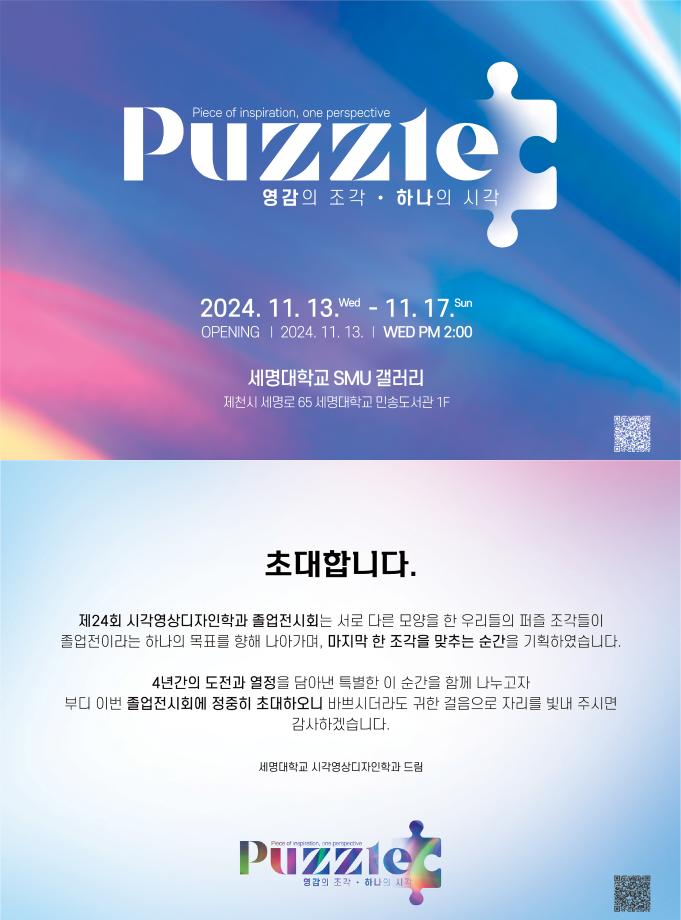 본문 시작 홈으로 시영소식 학과소개 학과과정 시영소식 입학/취업 AI 학과자랑 SNS소통 홈페이지가이드 학과행사 공지사항 학과행사 공모전 학생 인터뷰 학과행사 페이스북 트위터 프린트 2024 졸업전시회 오프닝 시각영상디자인학과 1979 2024-11-07 본교 캠퍼스에서 총장님을 모시고 11월 13일 오후2시에 본교 캠퍼스 smu갤러리에서 오프닝행사를 성대히 치렀습니다, 4학년 모두의 노고에 감사하고 다시 한번 졸전을 축하합니다 모바일 초대장 https://dodoring12.github.io/ 목록 이전2024 세명 콘텐츠 스쿨 콘텐츠 피칭 다음 햄버거데이 담당부서 : 시각영상디자인학과 담당자 : - 연락처 : 043-649-1726 최종수정일 : 2024-10-26 만족도조사 만족도 조사 이 페이지에서 제공하는 정보에 대하여 만족하시나요? 매우만족 만족 보통 불만족 매우불만족
