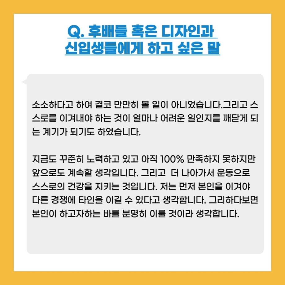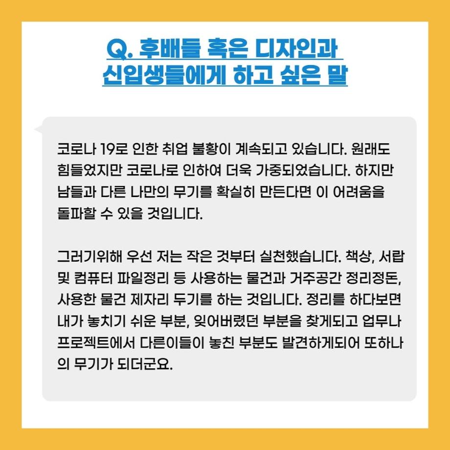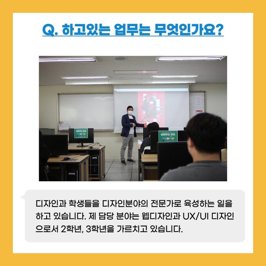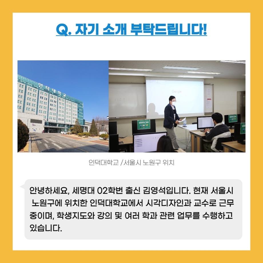 본문 시작 홈으로 입학/취업 학과소개 학과과정 시영소식 입학/취업 AI 학과자랑 SNS소통 홈페이지가이드 취업지금 입학여기 취업지금 전공소개 취업지금 페이스북 트위터 프린트 자랑스럽고 빛나는 선배들 2탄! 시각영상디자인학과 2556 2022-02-07 목록 이전자랑스럽고 빛나는 선배들 1탄! 다음 시디과 졸업 후 어디로 나아갈까? 3 담당부서 : 시각영상디자인학과 담당자 : - 연락처 : 043-649-1726 최종수정일 : 2024-10-26 만족도조사 만족도 조사 이 페이지에서 제공하는 정보에 대하여 만족하시나요? 매우만족 만족 보통 불만족 매우불만족