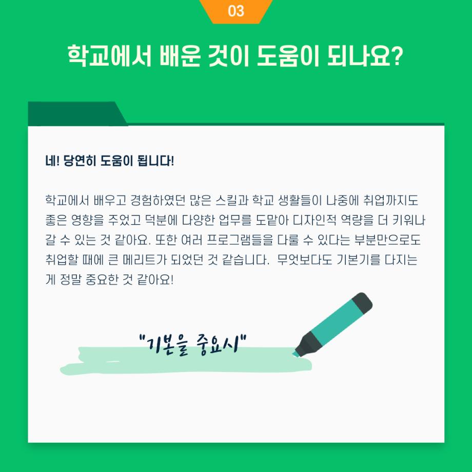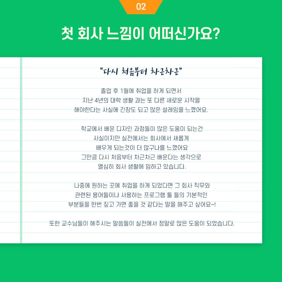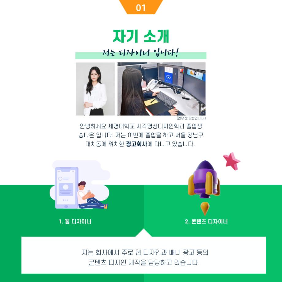 본문 시작 홈으로 입학/취업 학과소개 학과과정 시영소식 입학/취업 AI 학과자랑 SNS소통 홈페이지가이드 취업지금 입학여기 취업지금 전공소개 취업지금 페이스북 트위터 프린트 시각영상디자인학과 19학번 송나은 졸업생 - 서울 강남구 대치동 광고회사 취업! 시각영상디자인학과 2588 2023-02-27 목록 이전「대한민국 채용박람회」 개최 안내 다음 시각영상디자인학과 윤지훈 졸업생 - 가산디지털단지 디자인회사 취업! 담당부서 : 시각영상디자인학과 담당자 : - 연락처 : 043-649-1726 최종수정일 : 2024-10-26 만족도조사 만족도 조사 이 페이지에서 제공하는 정보에 대하여 만족하시나요? 매우만족 만족 보통 불만족 매우불만족