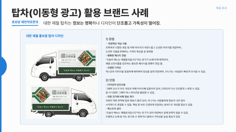 제천의 전통 식품 자원을 현대적인 감각으로 재해석하여, 지역성과 고유한 매력을 살린 호유당 브랜드의 탑차(이동형 광고) 차량 디자인 시안 4종을 제작했습니다. 또한 브랜드 인지도 강화를 위해 차량 방향제, 한과 모티프 키링, 바디 필로우, 녹용 뿔 볼펜 등 다양한 굿즈를 기획·디자인하였으며, 이를 AI 시각화로 표현하여 호유당만의 독창적이고 친근한 브랜드 이미지를 제안하였습니다.