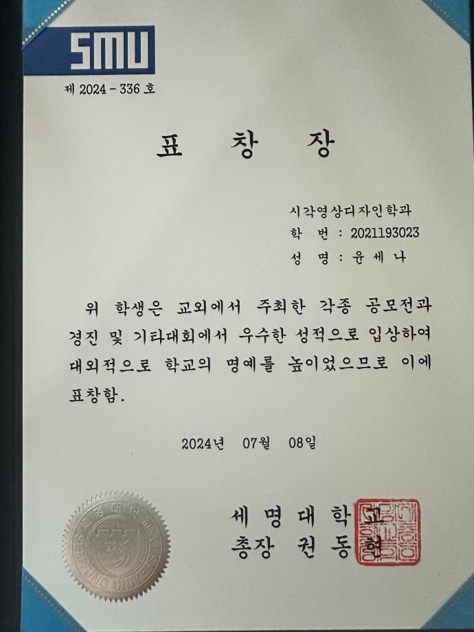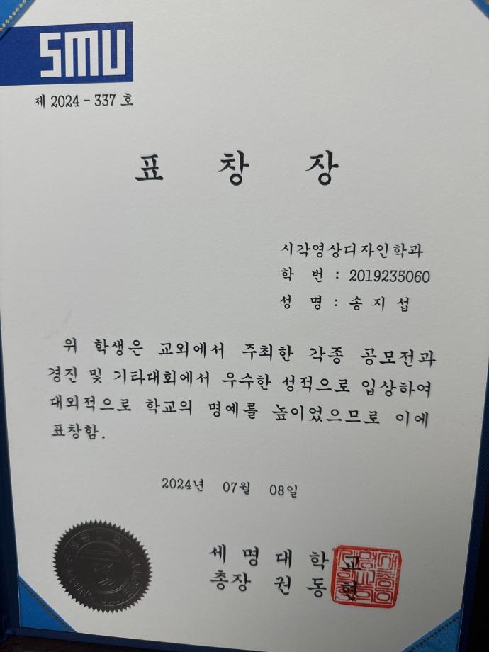 본문 시작 홈으로 학과자랑 학과소개 학과과정 시영소식 입학/취업 AI 학과자랑 SNS소통 홈페이지가이드 학과자랑 학과자랑 갤러리 공모전 동아리 졸업전시회 학과자랑 페이스북 트위터 프린트 2024학년도 1학기 총장표창 (시각영상디자인학과 3명 수상) 시각영상디자인학과 1786 2024-08-01 2024학년도 1학기 총장표창 (시각영상디자인학과 3명 수상) -학교의 명예를 빛낸 학생들에게 수여하는 총장 표창을 시각영상디자인학과에서 3명이 수상하였습니다~ (2023 국제사이버디자인트렌드공모전 대상/ 금상 수상 등) 목록 이전2024 여름 현장실습 학생 인터뷰 다음 외국인 근로자를 위한 숏폼 영상 공모전 - DO YOU KNOW 안전? 담당부서 : 시각영상디자인학과 담당자 : - 연락처 : 043-649-1726 최종수정일 : 2024-10-26 만족도조사 만족도 조사 이 페이지에서 제공하는 정보에 대하여 만족하시나요? 매우만족 만족 보통 불만족 매우불만족