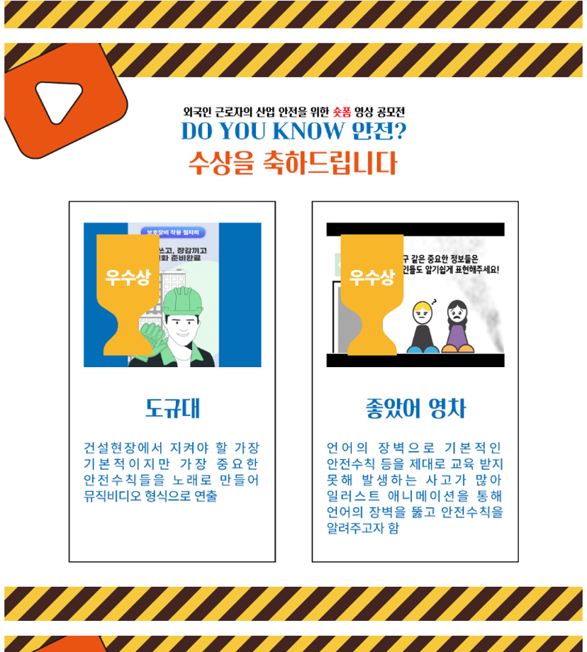 본문 시작 홈으로 학과자랑 학과소개 학과과정 시영소식 입학/취업 AI 학과자랑 SNS소통 홈페이지가이드 학과자랑 학과자랑 갤러리 공모전 동아리 졸업전시회 학과자랑 페이스북 트위터 프린트 외국인 근로자를 위한 숏폼 영상 공모전 - DO YOU KNOW 안전? 시각영상디자인학과 1828 2024-09-08 2학년 심*호/방*림팀(좋았어 영차)이 우수상을 수상하엿습니다~ 축하합니다~ 외국인 근로자의 산업안전을 위한 숏폼 영상 공모전 (safetycon.kr) [본선진출후보작] 꼭 알아둬요! 산업 안전 수칙! (youtube.com) 목록 이전2024학년도 1학기 총장표창 (시각영상디자인학과 3명 수상) 다음 졸업생 인터뷰 - 20학번 졸업생 이*현 담당부서 : 시각영상디자인학과 담당자 : - 연락처 : 043-649-1726 최종수정일 : 2024-10-26 만족도조사 만족도 조사 이 페이지에서 제공하는 정보에 대하여 만족하시나요? 매우만족 만족 보통 불만족 매우불만족