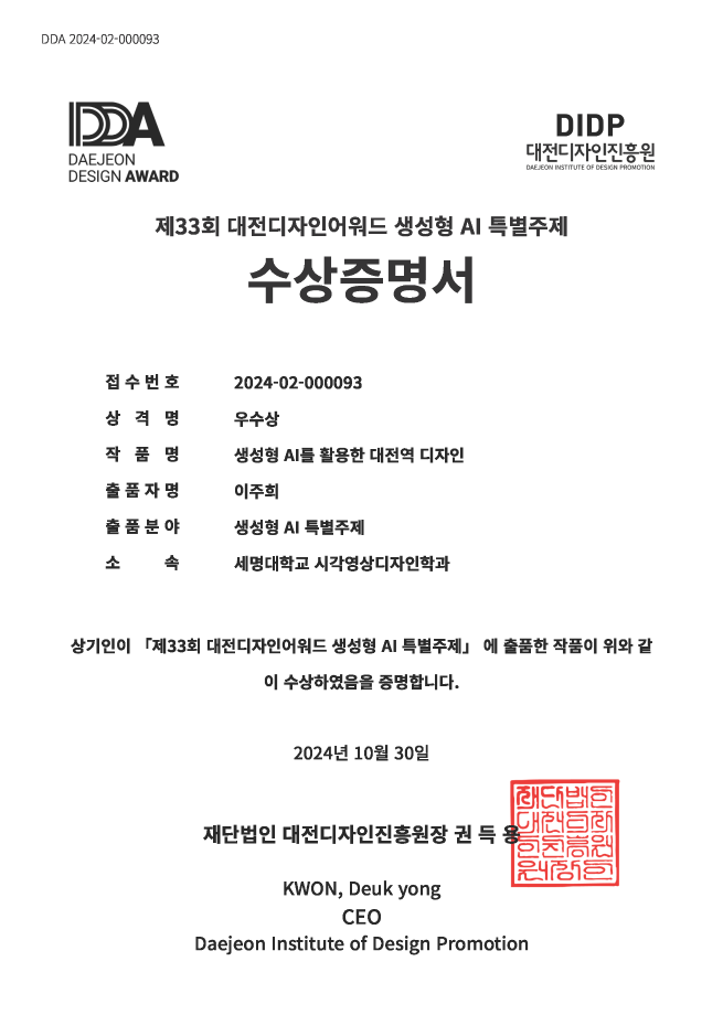 본문 시작 홈으로 학과자랑 학과소개 학과과정 시영소식 입학/취업 AI 학과자랑 SNS소통 홈페이지가이드 학과자랑 학과자랑 갤러리 공모전 동아리 졸업전시회 학과자랑 페이스북 트위터 프린트 제33회 대전디자인어워드-우수상 시각영상디자인학과 1680 2024-11-02 제33회 대전디자인어워드의 생성형 AI 특별주제부분에서 우수상(생성형 AI를 활용한 대전역 디자인-이*희학생)을 수상하였습니다 이밖에 고*호, 윤*환, 조*니학생이 특선 수상하엿습니다 목록 이전졸업생 인터뷰 - 20학번 졸업생 이*현 다음 시장 서비스러닝 / 벽화 서비스러닝 담당부서 : 시각영상디자인학과 담당자 : - 연락처 : 043-649-1726 최종수정일 : 2024-10-26 만족도조사 만족도 조사 이 페이지에서 제공하는 정보에 대하여 만족하시나요? 매우만족 만족 보통 불만족 매우불만족