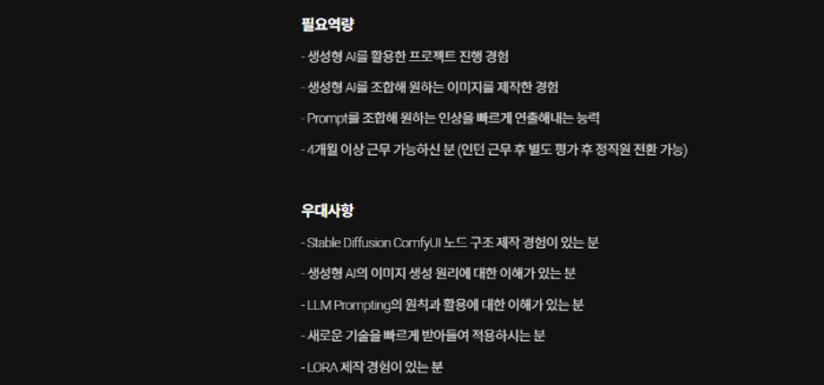 업무는 생성형 AI를 활용한 신규 서비스 개발, 신규 AI 메타 휴먼 생성 및 관리, 생성형 AI를 활용한 브랜드 키 비주얼 생성 이다.