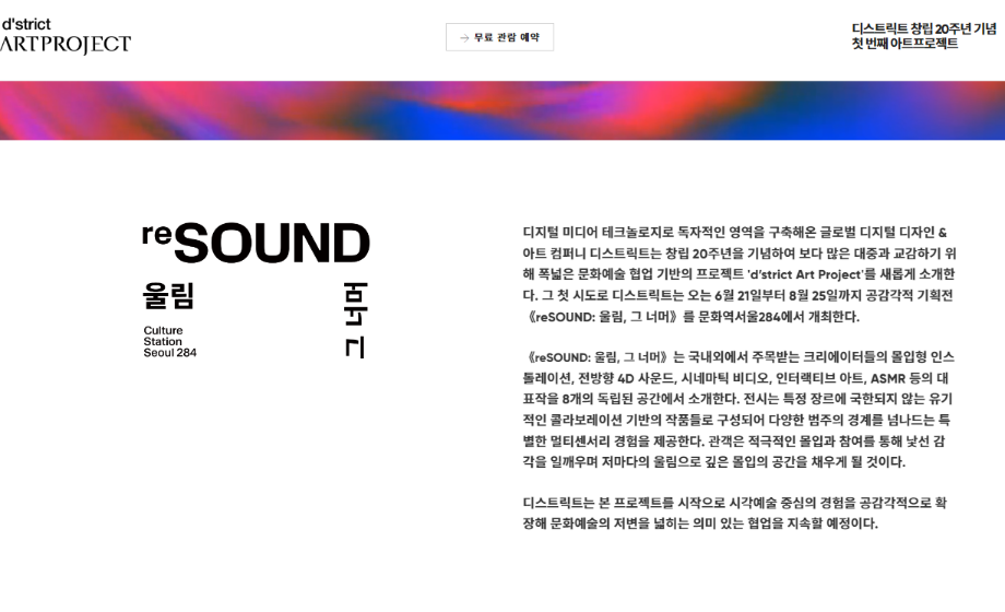 본문 시작 홈으로 AI 학과소개 학과과정 시영소식 입학/취업 AI 학과자랑 SNS소통 홈페이지가이드 디자인 정보 디자인 정보 AI 콘텐츠 연구소(AI 디자인) 디자인 정보 페이스북 트위터 프린트 디스트릭트 창립20주년 기념 첫번째 아트프로젝트 시각영상디자인학과 1864 2024-06-10 디스트릭트 창립20주년 기념 첫번째 아트프로젝트 https://artproject.dstrict.com/ 전시기간 2024. 06. 21 ~ 08. 25 관람시간 : 화 - 일요일 오전 11시 ~ 오후 7시 (매주 월요일 휴관) 사전예약 후 무료관람 목록 이전2024년, 인공지능은 우리의 일하는 방식을 바꾸었을까? 다음 <DDP 개관 10주년 기념 포스터> 전시 만족도조사 만족도 조사 이 페이지에서 제공하는 정보에 대하여 만족하시나요? 매우만족 만족 보통 불만족 매우불만족