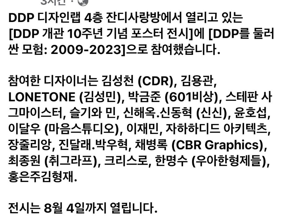 본문 시작 홈으로 AI 학과소개 학과과정 시영소식 입학/취업 AI 학과자랑 SNS소통 홈페이지가이드 디자인 정보 디자인 정보 AI 콘텐츠 연구소(AI 디자인) 디자인 정보 페이스북 트위터 프린트 <DDP 개관 10주년 기념 포스터> 전시 시각영상디자인학과 1771 2024-06-13 <DDP 개관 10주년 기념 포스터> 전시 일정 2024-04-26 ~ 2024-08-04 ※연중무휴 장소 동대문디자인플라자(DDP) 디자인랩 4층 잔디사랑방, 뮤지엄 B2~1F 디자인둘레길 시간 10:00-20:00 관람비용 무료 https://ddp.or.kr/index.html?menuno=230&siteno=2&bbsno=518&boardno=15&bbstopno=518&act=view&subno= 목록 이전디스트릭트 창립20주년 기념 첫번째 아트프로젝트 다음 《미래긍정: 노먼 포스터, 포스터 + 파트너스》 만족도조사 만족도 조사 이 페이지에서 제공하는 정보에 대하여 만족하시나요? 매우만족 만족 보통 불만족 매우불만족