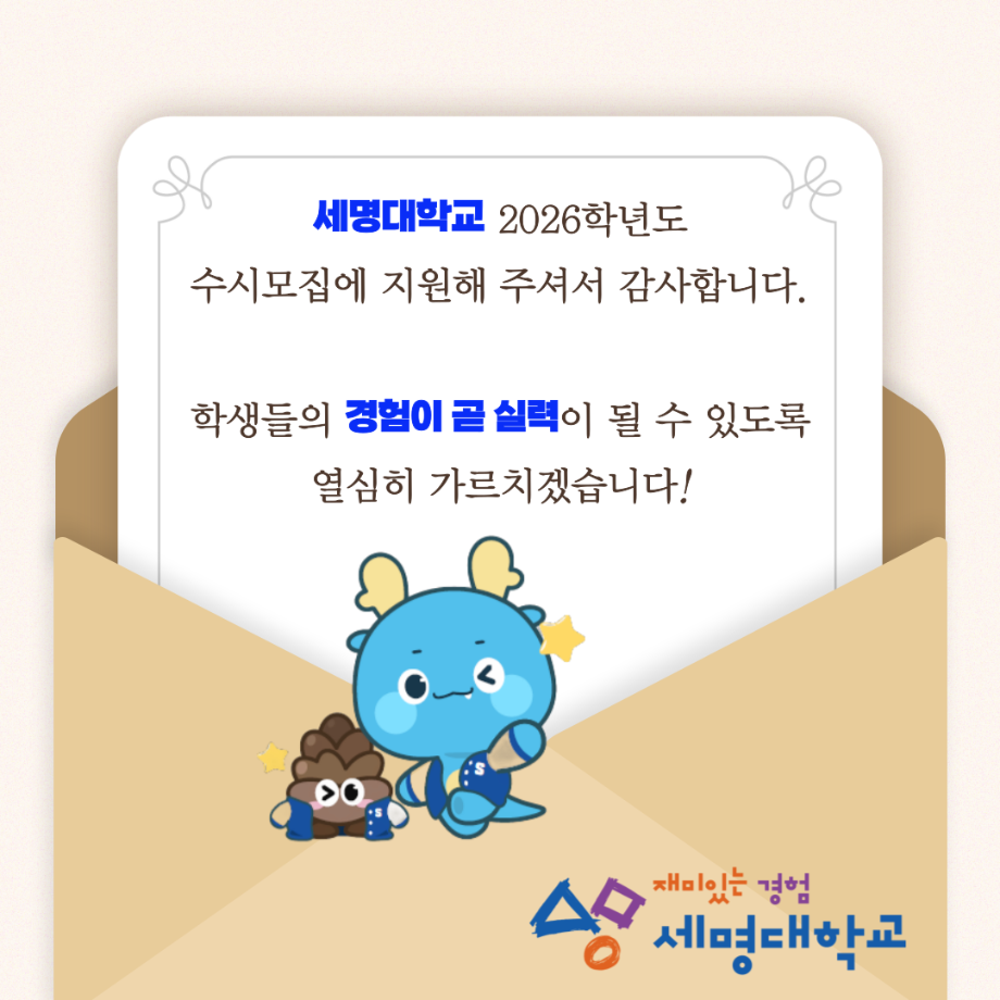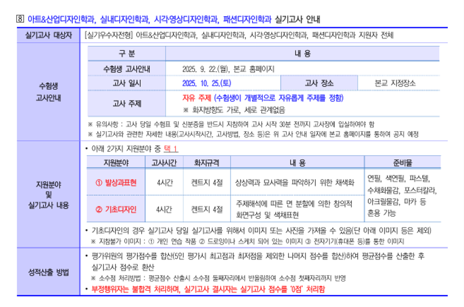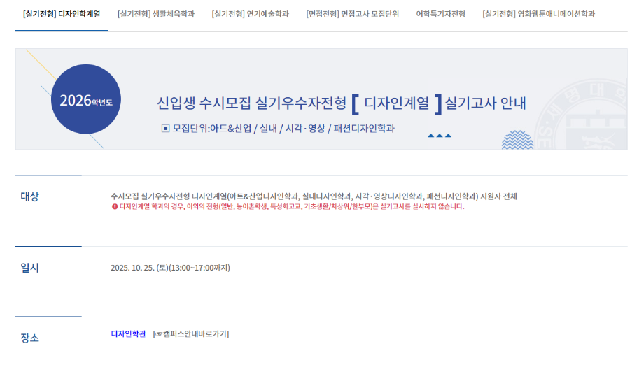 본문 시작 홈으로 입학/취업 학과소개 학과과정 시영소식 입학/취업 AI 학과자랑 SNS소통 홈페이지가이드 입학여기 입학여기 취업지금 전공소개 입학여기 페이스북 트위터 프린트 2026 수시모집 디자인계열학과 실기고사 안내 - 시각영상디자인학과 시각영상디자인학과 955 2025-10-01 2026 수시모집 디자인계열학과 실기고사 안내- 시각영상디자인학과 실기고사 안내 바로가기 > https://www.semyung.ac.kr/ipsi/sub01_07_03.do 목록 이전8월 12일 -중고등학생 대상 취업 특강- AI 브랜딩 다음 세명대학교_2026학년도 정시모집요강 만족도조사 만족도 조사 이 페이지에서 제공하는 정보에 대하여 만족하시나요? 매우만족 만족 보통 불만족 매우불만족