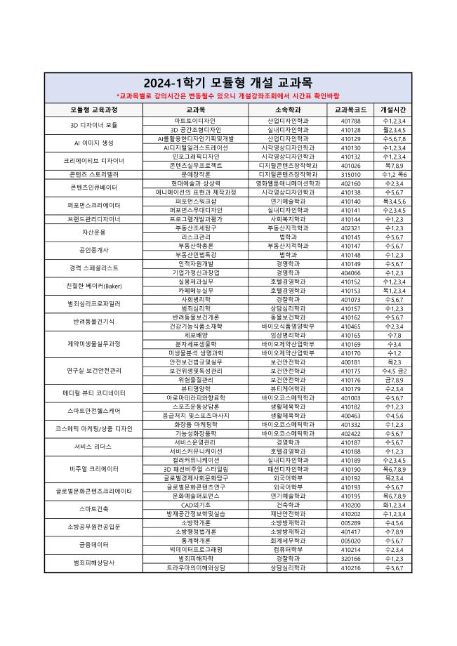 시각영상디자인학과에서는 2024-1학기 아래 3개 과목이 개설되어있습니다.